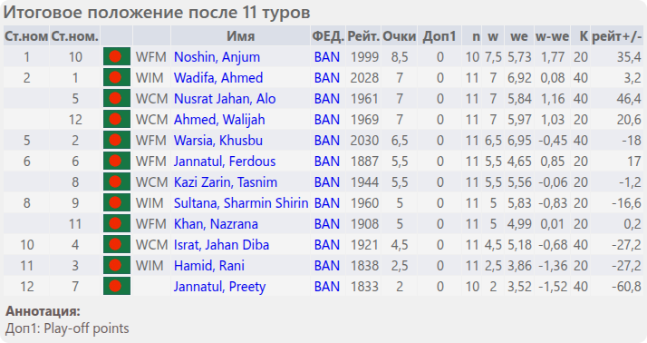 Победительницей чемпионата Бангладеш по шахматам среди женщин в Дакке (Бангладеш) стала Анджум Ношим 31 октября 2025 года. Первое место с 8½ очками из 9 заняла Анджум Ношим (рейтинг ФИДЕ 1999). На полтора очка отстали, занявшие по результатам тай-брейка в быстрые шахматы соответствующие места: Вадифа Ахмед (2028) — второе место, Ало Нусрат Джахан (1961) — третье место и Валиджа Ахмед (1969) — четвертое место. Напомним, финал 43-го чемпионат Бангладеш по шахматам среди женщин проходил в Дакке (Бангладеш) с 20 по 31 октября по круговой системе с классиче ... Читать дальше » |