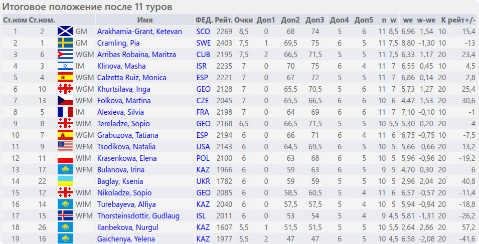 Победительницей женского чемпионата мира по шахматам среди ветеранов (старше 50 лет) в Галлиполи (Италия) стала Кетеван Арахамия-Грант 1 ноября 2025 года. Первое место с 8½ очками из 11 заняла Кетеван Арахамия-Грант (Шотландия, рейтинг ФИДЕ 2269). На очко отстали Пиа Крамлинг (Швеция, 2403) — второе место по дополнительным показателям и Марица Аррибас Робайна (Куба, 2195) — третье место. Напомним, женский чемпионат мира по шахматам среди ветеранов (старше 50 лет) проходил в Галлиполи (Италия) с 21 октября по 1 ноября по швейцарской системе в 11 туров с классическим контролем времени. В турнире участвовала 31 шахматистка ... Читать дальше » |