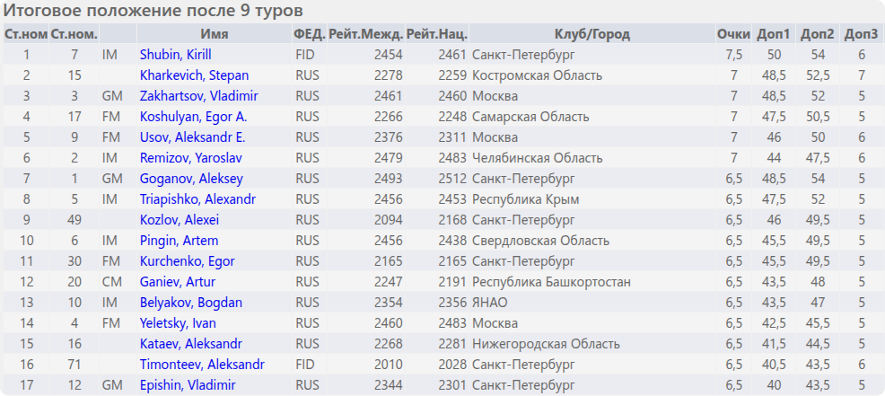 Победителем этапа Кубка России по шахматам в Санкт-Петербурге стал Кирилл Шубин 2 ноября 2025 года. Первое место с 7½ очками из 9 занял Кирилл Шубин (национальный рейтинг 2461). На пол-очка отстали, заняв 2 — 6 места по дополнительным показателям в следующем порядке: Степан Харкевич (2259), Владимир Захарцов (2460), Егор Кошулян (2248), Александр Усов (2311) и Ярослав Ремизов (2483). Напомним, этап Кубка России по шахматам «Мемориал М.И. Чигорина» проходил в Санкт-Петербург с 25 октября по 2 ноября по швейцарской системе в 9 туров с классическ ... Читать дальше » |