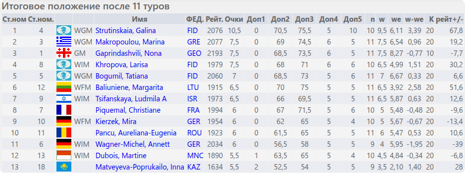 Победительницей женского чемпионата мира по шахматам среди ветеранов (старше 65 лет) в Галлиполи (Италия) стала Галина Струтинская 1 ноября 2025 года. Первое место с 10½ очками из 11 заняла Галина Струтинская (Россия, рейтинг ФИДЕ 2076). На три очка отстали Марина Макропулу (Греция, 2077) — второе место по дополнительным показателям, Нона Гаприндашвили (Грузия, 2193) — третье место и Лариса Хропова (Россия, 1979) — четвертое место. Напомним, женский чемпионат мира по шахматам среди ветеранов (старше 65 лет) проходил в Галлиполи (Италия) с 21 октября по 1 но ... Читать дальше » |