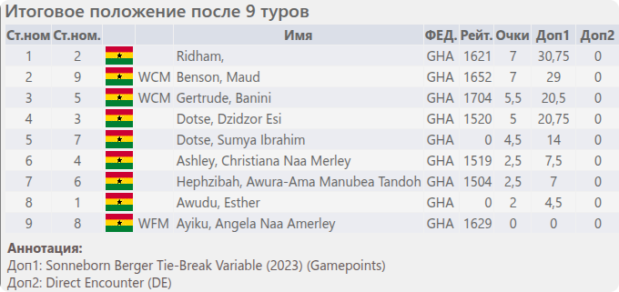 Победительницей чемпионата Ганы по шахматам в Аккре (Гана) стала Ридхам 18 января 2026 года. По 7 очков из 8 набрали Ридхам (рейтинг ФИДЕ 1621) — первое место по дополнительным показателям и Мауд Бенсон (1652) — второе место. На полтора очка отстала Банини Гертруде (1704) — третье место. Напомним, чемпионат Ганы по шахматам среди женщин проходил в Аккре (Гана) с 16 по 18 января по круговой системе с контролем времени 60 минут на партию с добавлением 30 секунд за каждый сделанный ход, начиная с первого. В турнире участвовало 9 шахматисток. |