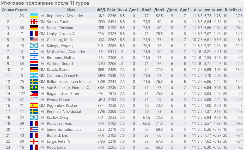 Победителем чемпионата мира по шахматам среди ветеранов (старше 65 лет) в Галлиполи (Италия) стал Александр Репринцев 1 ноября 2025 года. По 8½ очков из 11 набрали Александр Репринцев (Украина, рейтинг ФИДЕ 2256) — первое место по дополнительным показателям, Зураб Стуруа (Грузия, 2491) — второе место, Кристиан Майер (Германия, 2192) — третье место, Николай Легкий (Франция, 2325) — четвертое место, Марк Гинсбург (США, 2262) — пятое место и Евгений Калегин (Россия, 2285) — шестое место. Напомним, чемпионат мира по шахматам среди ветеранов (старше 65 лет) проходил в Галлиполи (Италия ... Читать дальше » |