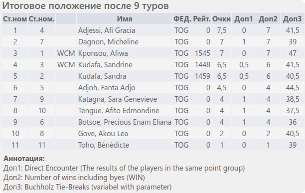 Победительницей чемпионата Того по шахматам среди женщин в Кпалиме (Того) стала Афи Грация Аджесси 31 октября 2025 года. Первое место с 7½ очками из 9 заняла Афи Грация Аджесси. На пол-очка отстали Мишлен Дагнон — второе место по дополнительным показателям и Афива Кпонсу (рейтинг ФИДЕ 1545) — третье место. Напомним, чемпионат Того по шахматам среди женщин проходил в Кпалиме (Того) с 25 по 31 октября по швейцарской системе в 9 туров с классическим контролем времени. В турнире участвовали 11 шахматисток. |
