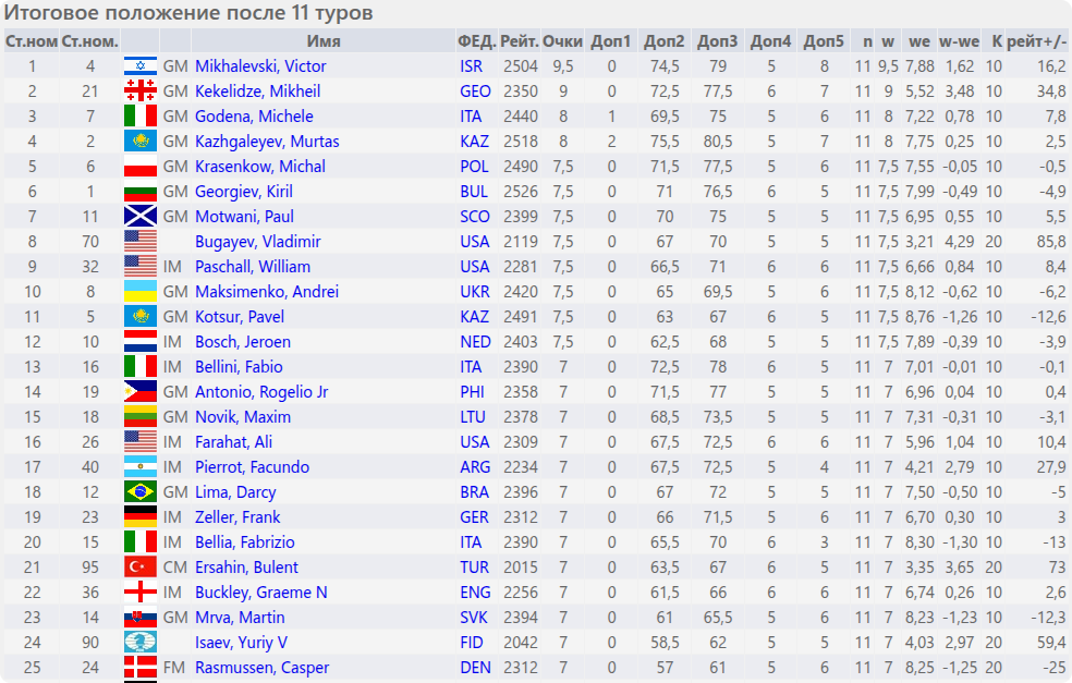 Победителем чемпионата мира по шахматам среди ветеранов (старше 50 лет) в Галлиполи (Италия) стал Виктор Михалевский 1 ноября 2025 года. Первое место с 9½ очками из 11 занял Виктор Михалевский (Израиль, рейтинг ФИДЕ 2504). На пол-очка отстал Михаил Кекелидзе (Грузия, 2350) — второе место. По 8 очков набрали Микеле Годена (Италия, 2440) — третье место по дополнительным показателям и Муртас Кажгалеев (Казахстан, 2518) — четвертое место. Напомним, чемпионат мира по шахматам среди ветеранов (старше 50 лет) проходил в Галлиполи (Италия) с 21 октября по 1 ноября< ... Читать дальше » |