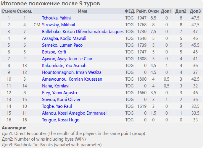 Победителем чемпионат Того по шахматам среди мужчин в Кпалиме (Того) стал Якини Чука 31 октября 2025 года. Первое место с 8½ очками из 9 занял Якини Чука (рейтинг ФИДЕ 1947). На пол-очка отстал Михаил Стровский (1768) — второе место. 7½ очков набрал Коку Дифендрамакада Жак Баллебако (1730) — третье место. Напомним, чемпионат Того по шахматам среди мужчин проходил в Кпалиме (Того) с 25 по 31 октября по швейцарской системе в 9 туров с классическим контролем времени. В турнире участвовали 16 шахматистов. |