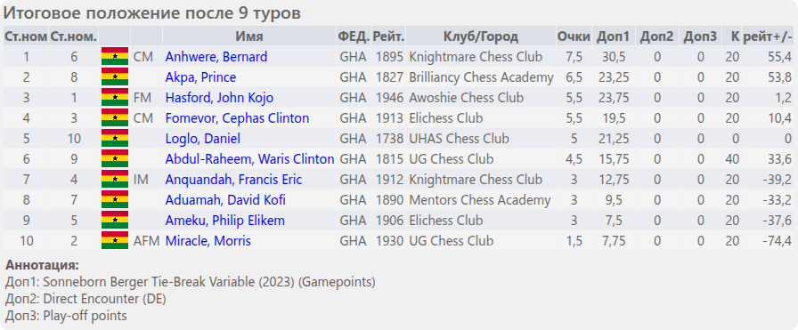 Победителем чемпионата Ганы по шахматам в Аккре (Гана) стал Бернард Анхвер 18 января 2026 года. Первое место с 7½ очками из 9 занял Бернард Анхвер (рейтинг ФИДЕ 1895). На очко отстал Принс Акпа (1827) — второе место. По 5½ очков набрали Джон Коджо Хасворд (1946) — третье место по дополнительным показателям и Сефас Клинтон Фомевор (1913) — четвертое место. Напомним, чемпионат Ганы по шахматам проходил в Аккре (Гана) с 10 по 18 января по круговой системе с классическим контролем времени. В турнире участвовали 10 шахматистов. |