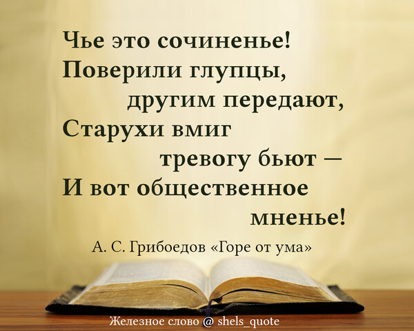 Чье это сочиненье! Поверили глупцы, другим передают, Старухи вмиг тревогу бьют — И вот общественное мненье! А. С. Грибоедов «Горе от ума» |