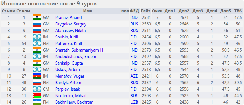 Первое место с 7 очками из 9 занял Ананд Пранав (Индия, рейтинг ФИДЕ 2581).