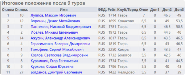 Первое место с 7 очками из 9 занял Максим Луппов (национальный рейтинг 1714).