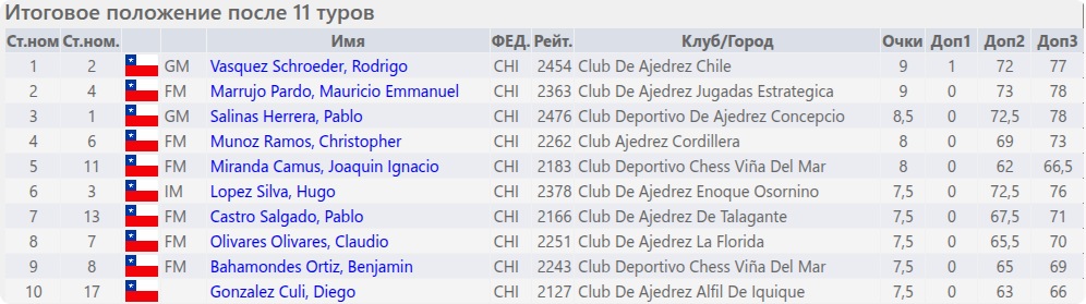 Победителем чемпионата Чили по шахматам в Сантьяго стал Родриго Васкес Шрёдер 28 февраля 2026 года. По 9 очков из 11 набрали Родриго Васкес Шрёдер (рейтинг ФИДЕ 2454) — первое место по дополнительным показателям и Маурисио Эммануэль Марухо Пардо (2363) — второе место. На пол-очка отстал Пабло Салинас Эррера (2476) — третье место. Напомним, чемпионат Чили по шахматам 2026 проходил в столице Сантьяго с 22 по 28 февраля по швейцарской системе в 11 туров с классическим контролем времени. В турнире участвовали 96 шахматистов. |