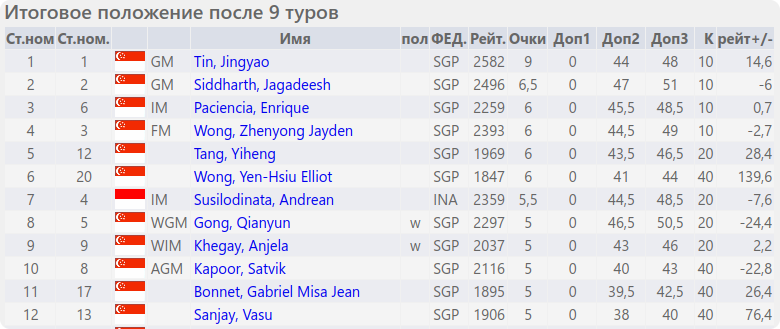 Со стопроцентным результатом победителем чемпионата Сингапура стал Тин Цзинъяо 18 февраля 2025 года. Первое место с 9 очками из 9 занял Тин Цзинъяо (рейтинг ФИДЕ 2582). На два с половиной очка отстал Сиддхарт Джагадиш (2496) — второе место. По 6 очков набрали четыре шахматиста, третье место по дополнительным показателям занял Энрике Пасьенция (2259). Напомним, 76-й чемпионат Сингапура по шахматам проходил со 2 по 18 февраля по швейцарской системе в 9 туров с классическим контролем времени. В турнире участвовали 30 шахматистов. |